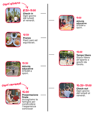 Ogni giorno, dal lunedì al venerdì dalle 8:30 alle 17:00, i/le partecipanti vivono un’esperienza unica all’interno del Campus di H-FARM. Durante l’arco della giornata si alternano laboratori digitali e attività sportive, intervallati a momenti di svago, per stimolare lo sviluppo cognitivo, fisico e sociale di ciascuno.